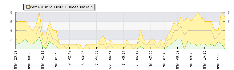 In the last few minutes the wind was North Westerly at an average speed of 1 knots, reaching up to 1 knots and a low of 0 knots. The gust strength is1 knots above the minimum speed |