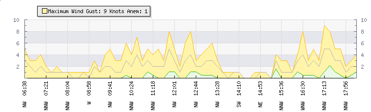 In the last few minutes the wind was North North West at an average speed of 5 knots, reaching up to 9 knots and a low of 1 knots. The gust strength is8 knots above the minimum speed |