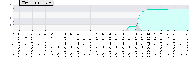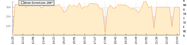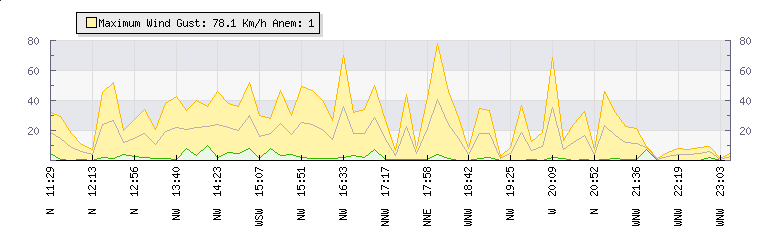 | Wind Gust: | 78 km/h | Min Temp: | 7.4 °C | Max Temp: | 17.4 °C | | Wind Average: | 41 km/h | Min Hum: | 85 % | Max Hum: | 89 % | |  |
