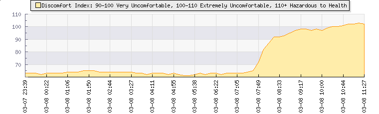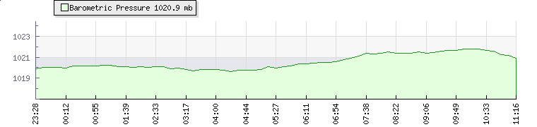 | Wind Speed: | 0|6|12 kmh | Wind Direction: | SSW 206° | Temperature: | 30.8°C | | Wet Bulb: | 21.1°C | Discomfort: | 98 | Humidity: | 40% | | Rainfall Today: | 0mm | 12 hrs Rainfall: | 0mm | 24 hrs Rainfall: | 0mm | | Barometer: | 1021.6mb | Dew Point: | 15.6°C | Clouds AGL: | 6072ft (1851 m) | | Density-Alt: | 1749ft (533 m) | UV Index: | 8 | Solar Radiation: | 523Wm² | | Fire Danger: | |