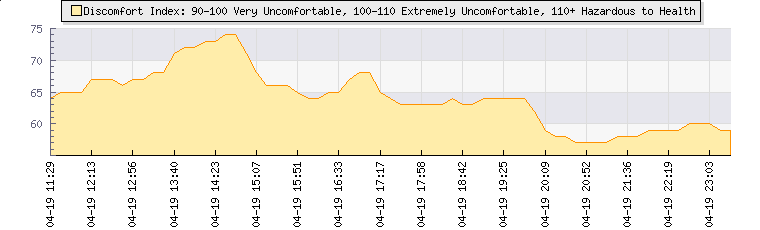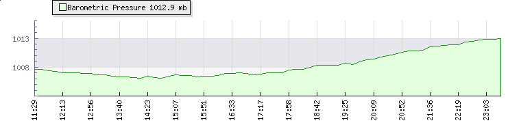 | Wind Speed: | 0|1|2 kmh | Wind Direction: | WNW 300° | Temperature: | 12.1°C | | Wet Bulb: | 10.7°C | Discomfort: | 59 | Humidity: | 87% | | Rainfall Today: | 6.9mm | 12 hrs Rainfall: | 6.9mm | 24 hrs Rainfall: | 6.9mm | | Barometer: | 1011.7mb | Dew Point: | 10°C | Clouds AGL: | 840ft (256 m) | | Density-Alt: | -148ft (-45 m) | Solar Radiation: | 514Wm² | Fire Danger: | |