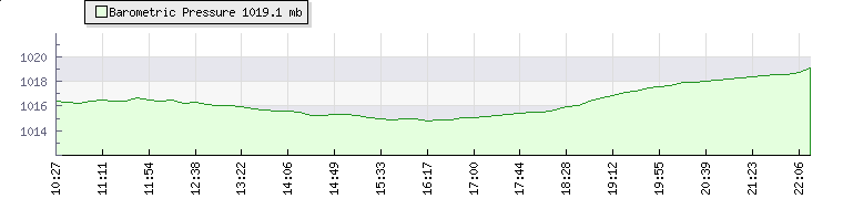 | Wind Speed: | 0|3|5 kmh | Wind Direction: | SSW 197° | Temperature: | 16.6°C | | Wet Bulb: | 12.4°C | Discomfort: | 68 | Humidity: | 64% | | Rainfall Today: | 0mm | 12 hrs Rainfall: | 0mm | 24 hrs Rainfall: | 0mm | | Barometer: | 1018.2mb | Dew Point: | 9.8°C | Clouds AGL: | 2737ft (834 m) | | Density-Alt: | 171ft (52 m) | Solar Radiation: | 521Wm² | Fire Danger: | |