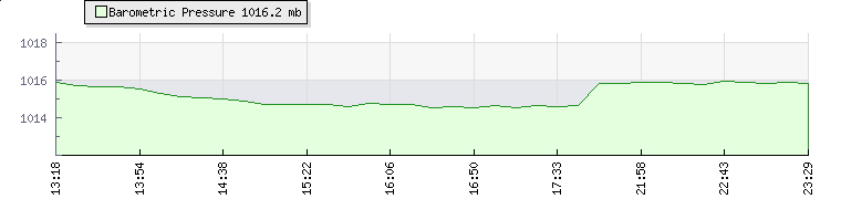 | Wind Speed: | 0|1|1 kmh | Wind Direction: | N 0° | Temperature: | 18.8°C | | Wet Bulb: | 14.8°C | Discomfort: | 74 | Humidity: | 67% | | Rainfall Today: | 0.3mm | 12 hrs Rainfall: | 0.3mm | 24 hrs Rainfall: | 0.3mm | | Barometer: | 1016.3mb | Dew Point: | 12.5°C | Clouds AGL: | 2504ft (763 m) | | Density-Alt: | 515ft (157 m) | Solar Radiation: | 516Wm² | Fire Danger: | |