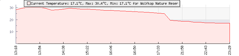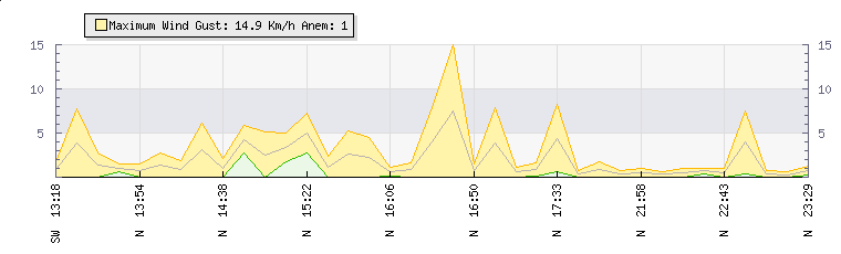 | Wind Gust: | 15 km/h | Min Temp: | 14.3 °C | Max Temp: | 30.4 °C | | Wind Average: | 8 km/h | Min Hum: | 53 % | Max Hum: | 89 % | |  |