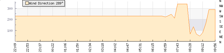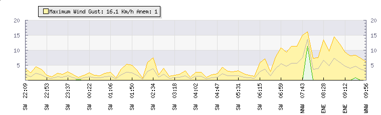 In the last few minutes the wind was North North West at an average speed of 4 kmh, reaching up to 7 kmh and a low of 0 kmh. The gust strength is7 kmh above the minimum speed |
