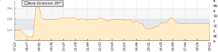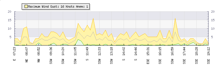 In the last few minutes the wind was South South East at an average speed of 2 knots, reaching up to 3 knots and a low of 0 knots. The gust strength is3 knots above the minimum speed |