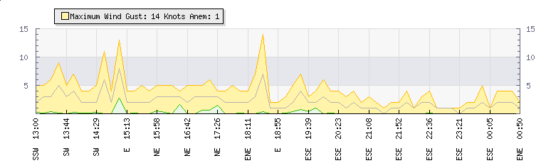 In the last few minutes the wind was South South West at an average speed of 2 knots, reaching up to 5 knots and a low of 0 knots. The gust strength is5 knots above the minimum speed |