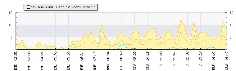In the last few minutes the wind was Easterly at an average speed of 3 knots, reaching up to 5 knots and a low of 0 knots. The gust strength is5 knots above the minimum speed |