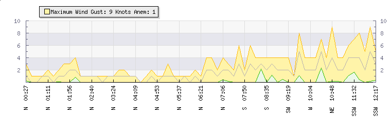 In the last few minutes the wind was West North West at an average speed of 2 knots, reaching up to 4 knots and a low of 0 knots. The gust strength is4 knots above the minimum speed |