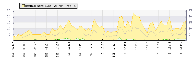 In the last few minutes the wind was East South East at an average speed of 8 mph, reaching up to 15 mph and a low of 0 mph. The gust strength is15 mph above the minimum speed |