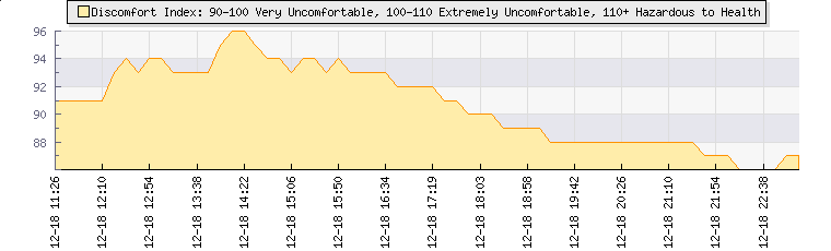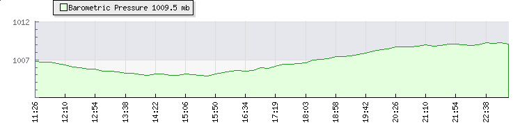 | Wind Speed: | 2|6|10 kmh | Wind Direction: | SSE 164° | Temperature: | 24.8°C | | Wet Bulb: | 22.4°C | Discomfort: | 94 | Humidity: | 82% | | Rainfall Today: | 0mm | 12 hrs Rainfall: | 0mm | 24 hrs Rainfall: | 0mm | | Barometer: | 1006.4mb | Dew Point: | 21.5°C | Clouds AGL: | 1316ft (401 m) | | Density-Alt: | 3333ft (1016 m) | Fire Danger: | |