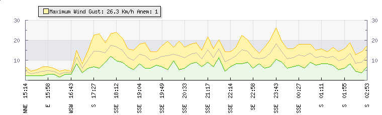 In the last few minutes the wind was South South East at an average speed of 12 kmh, reaching up to 18 kmh and a low of 6 kmh. The gust strength is12 kmh above the minimum speed |