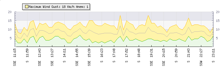In the last few minutes the wind was South South East at an average speed of 6 kmh, reaching up to 10 kmh and a low of 2 kmh. The gust strength is8 kmh above the minimum speed |