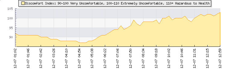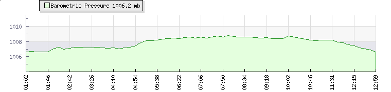 | Wind Speed: | 2|5|9 kmh | Wind Direction: | SSE 163° | Temperature: | 27.4°C | | Wet Bulb: | 23.6°C | Discomfort: | 99 | Humidity: | 73% | | Rainfall Today: | 0mm | 12 hrs Rainfall: | 0mm | 24 hrs Rainfall: | 0mm | | Barometer: | 1008.4mb | Dew Point: | 22.1°C | Clouds AGL: | 2112ft (644 m) | | Density-Alt: | 3566ft (1087 m) | Fire Danger: | |