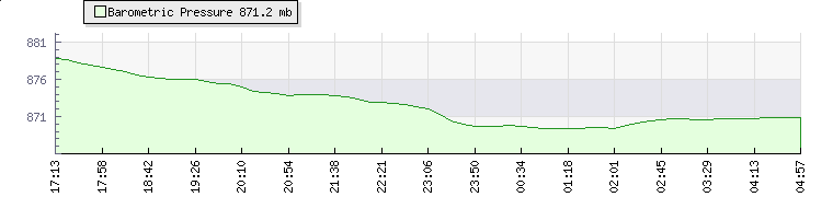 Wind Speed: | 8|12|17 kmh | Wind Direction: | S 183° | Temperature: | 16.7°C | Wet Bulb: | 14.6°C | Discomfort: | 71 | Humidity: | 82% | Rainfall Today: | 0.5mm | 12 hrs Rainfall: | 0.5mm | 24 hrs Rainfall: | 0.5mm | Barometer: | 870.1mb | Dew Point: | 13.6°C | Clouds AGL: | 1236ft (377 m) | Density-Alt: | 7169ft (2185 m) | Fire Danger: | |