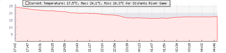 GPS Co-ordinates: | S 24º 9' 04, E 31º 2' 01 | ASL: | 1335 feet | Sunrise / Sunset: | 05:19 / 18:03 | Beaufort Scale: | Gentle Breeze |
