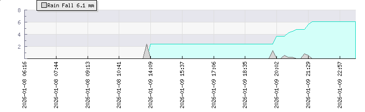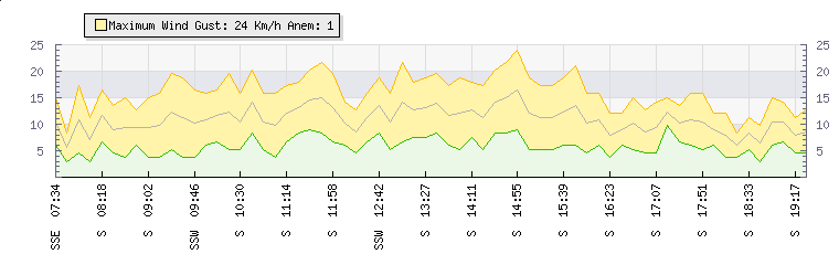 In the last few minutes the wind was Southerly at an average speed of 6 kmh, reaching up to 8 kmh and a low of 4 kmh. The gust strength is4 kmh above the minimum speed |