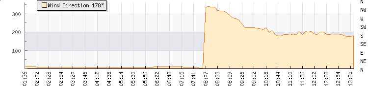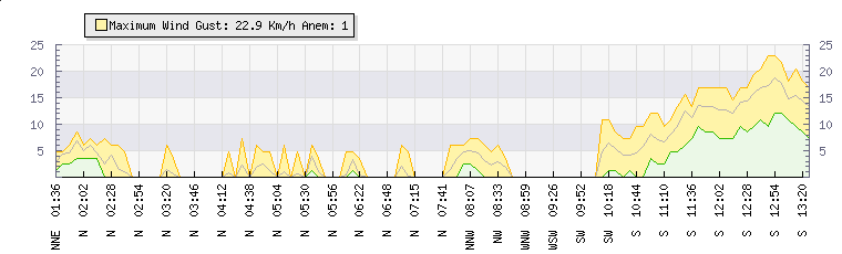 In the last few minutes the wind was South South West at an average speed of 13 kmh, reaching up to 16 kmh and a low of 6 kmh. The gust strength is10 kmh above the minimum speed |