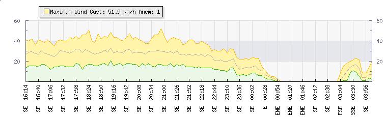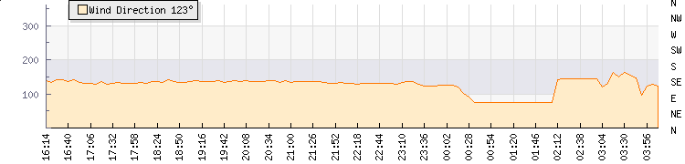 In the last few minutes the wind was South Easterly at an average speed of 0 kmh, reaching up to 0 kmh and a low of 0 kmh. The gust strength is0 kmh above the minimum speed |