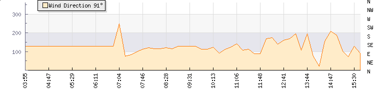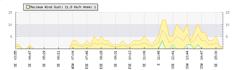 In the last few minutes the wind was East North East at an average speed of 3 kmh, reaching up to 3 kmh and a low of 2 kmh. The gust strength is1 kmh above the minimum speed |
