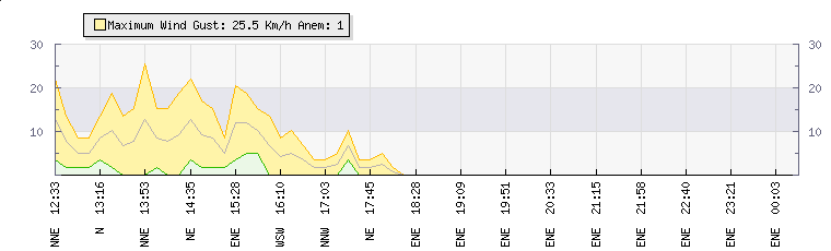 In the last few minutes the wind was East North East at an average speed of 0 kmh, reaching up to 0 kmh and a low of 0 kmh. The gust strength is0 kmh above the minimum speed |