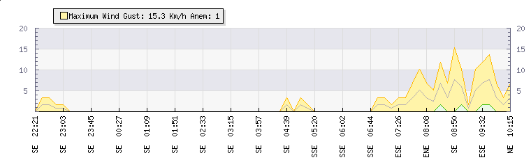 In the last few minutes the wind was Easterly at an average speed of 3 kmh, reaching up to 7 kmh and a low of 0 kmh. The gust strength is7 kmh above the minimum speed |