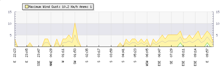 In the last few minutes the wind was East South East at an average speed of 2 kmh, reaching up to 3 kmh and a low of 0 kmh. The gust strength is3 kmh above the minimum speed |