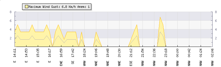 In the last few minutes the wind was South Westerly at an average speed of 3 kmh, reaching up to 7 kmh and a low of 0 kmh. The gust strength is7 kmh above the minimum speed |