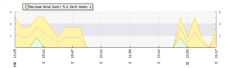 In the last few minutes the wind was South Easterly at an average speed of 1 kmh, reaching up to 2 kmh and a low of 0 kmh. The gust strength is2 kmh above the minimum speed |