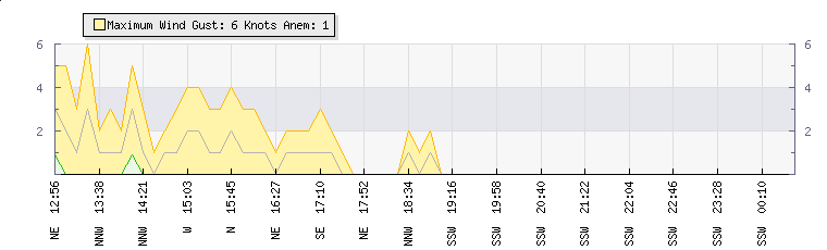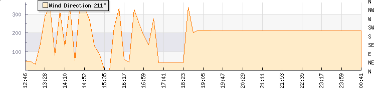 In the last few minutes the wind was South South West at an average speed of 0 knots, reaching up to 0 knots and a low of 0 knots. The gust strength is0 knots above the minimum speed |