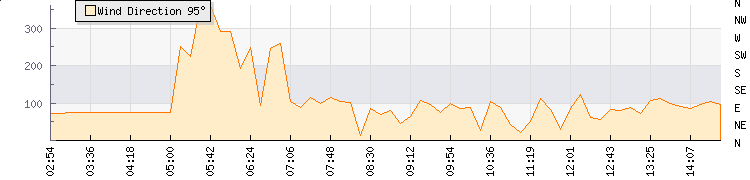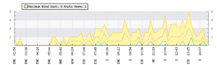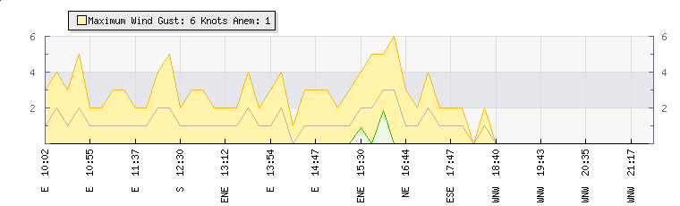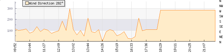 In the last few minutes the wind was West North West at an average speed of 0 knots, reaching up to 0 knots and a low of 0 knots. The gust strength is0 knots above the minimum speed |