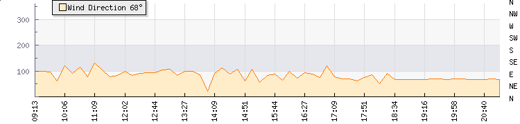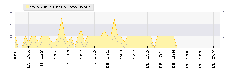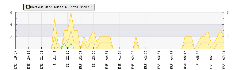 In the last few minutes the wind was East North East at an average speed of 0 knots, reaching up to 0 knots and a low of 0 knots. The gust strength is0 knots above the minimum speed |