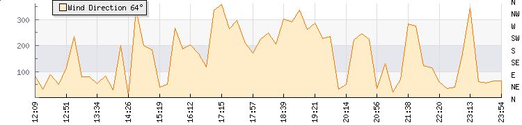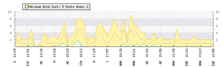 In the last few minutes the wind was North Easterly at an average speed of 1 knots, reaching up to 2 knots and a low of 0 knots. The gust strength is2 knots above the minimum speed |
