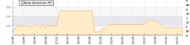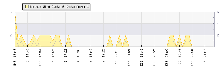 In the last few minutes the wind was South Easterly at an average speed of 0 knots, reaching up to 0 knots and a low of 0 knots. The gust strength is0 knots above the minimum speed |