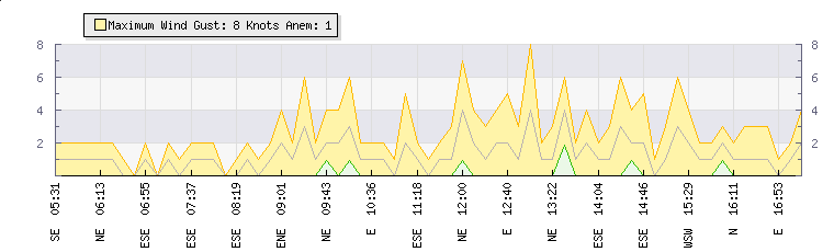 In the last few minutes the wind was Easterly at an average speed of 2 knots, reaching up to 5 knots and a low of 0 knots. The gust strength is5 knots above the minimum speed |