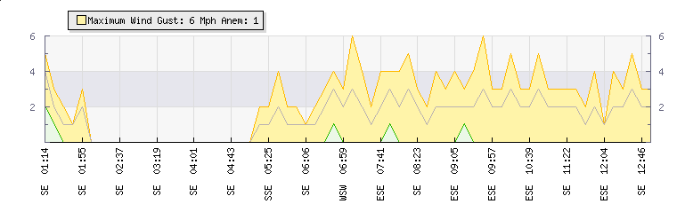 In the last few minutes the wind was East South East at an average speed of 2 mph, reaching up to 3 mph and a low of 0 mph. The gust strength is3 mph above the minimum speed |