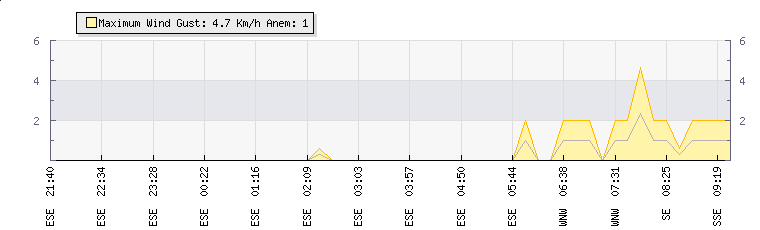In the last few minutes the wind was East South East at an average speed of 2 kmh, reaching up to 5 kmh and a low of 0 kmh. The gust strength is5 kmh above the minimum speed |