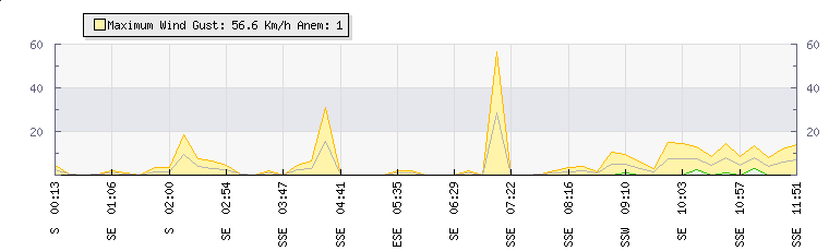 In the last few minutes the wind was South Easterly at an average speed of 7 kmh, reaching up to 15 kmh and a low of 0 kmh. The gust strength is15 kmh above the minimum speed |