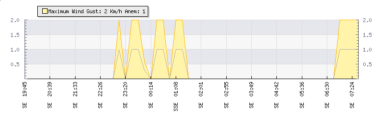 In the last few minutes the wind was South Easterly at an average speed of 0 kmh, reaching up to 0 kmh and a low of 0 kmh. The gust strength is0 kmh above the minimum speed |