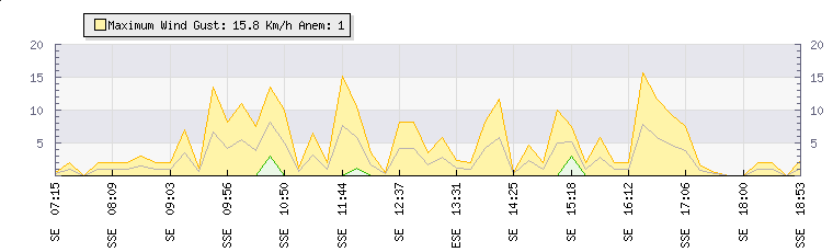 In the last few minutes the wind was South Easterly at an average speed of 1 kmh, reaching up to 1 kmh and a low of 0 kmh. The gust strength is1 kmh above the minimum speed |