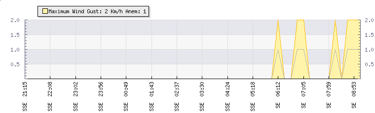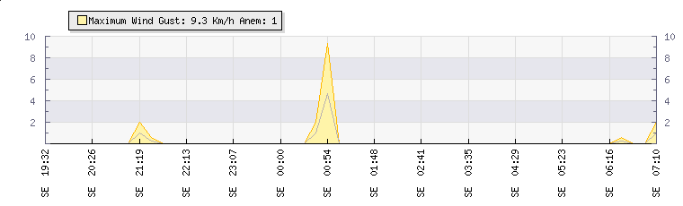 In the last few minutes the wind was South Easterly at an average speed of 0 kmh, reaching up to 0 kmh and a low of 0 kmh. The gust strength is0 kmh above the minimum speed |