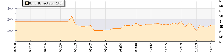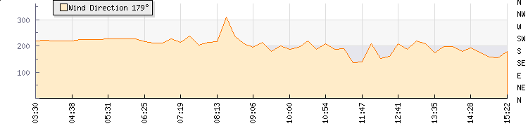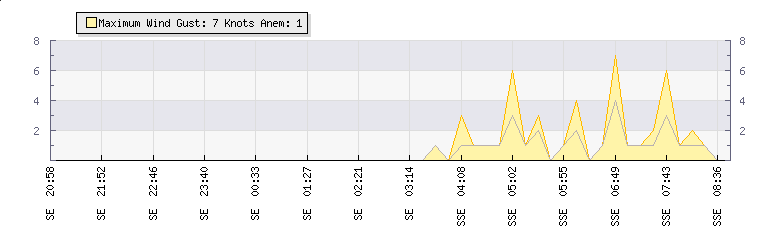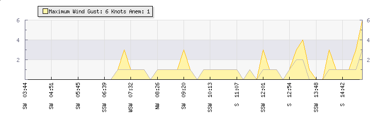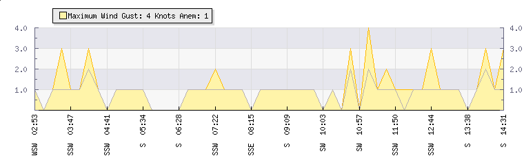 In the last few minutes the wind was South South East at an average speed of 1 knots, reaching up to 1 knots and a low of 0 knots. The gust strength is1 knots above the minimum speed |