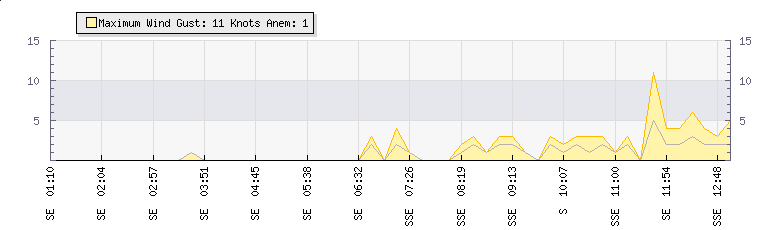 In the last few minutes the wind was South South East at an average speed of 2 knots, reaching up to 4 knots and a low of 0 knots. The gust strength is4 knots above the minimum speed |