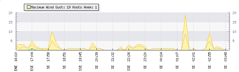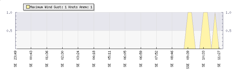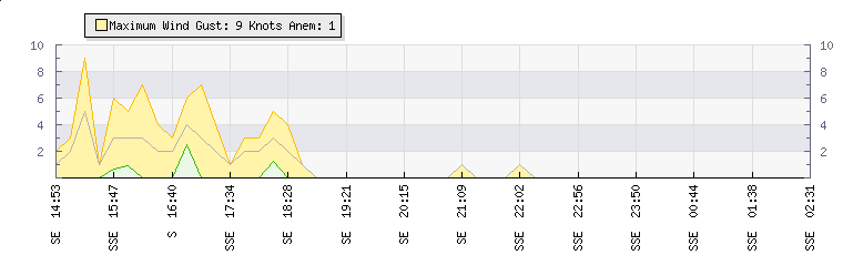 In the last few minutes the wind was South Easterly at an average speed of 0 knots, reaching up to 0 knots and a low of 0 knots. The gust strength is0 knots above the minimum speed |