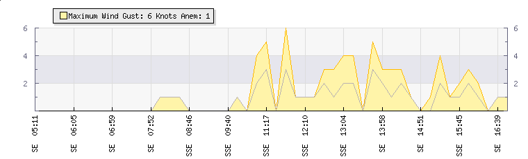 In the last few minutes the wind was South Easterly at an average speed of 1 knots, reaching up to 1 knots and a low of 0 knots. The gust strength is1 knots above the minimum speed |