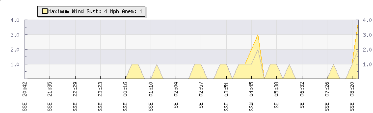 In the last few minutes the wind was South Easterly at an average speed of 0 mph, reaching up to 0 mph and a low of 0 mph. The gust strength is0 mph above the minimum speed |