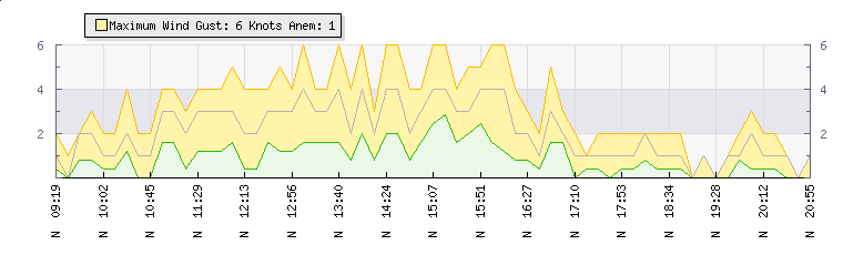 In the last few minutes the wind was Northerly at an average speed of 1 knots, reaching up to 1 knots and a low of 0 knots. The gust strength is1 knots above the minimum speed |