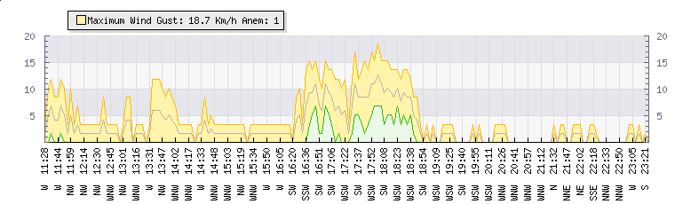In the last few minutes the wind was North Easterly at an average speed of 0 kmh, reaching up to 0 kmh and a low of 0 kmh. The gust strength is0 kmh above the minimum speed |