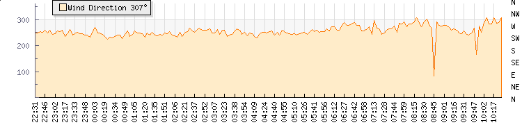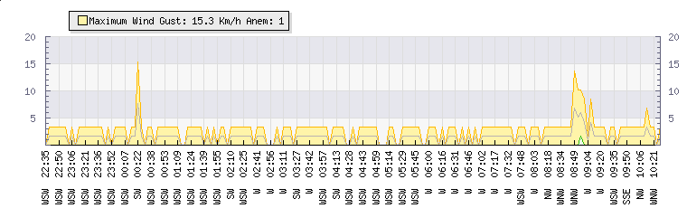 In the last few minutes the wind was Westerly at an average speed of 4 kmh, reaching up to 9 kmh and a low of 0 kmh. The gust strength is9 kmh above the minimum speed |