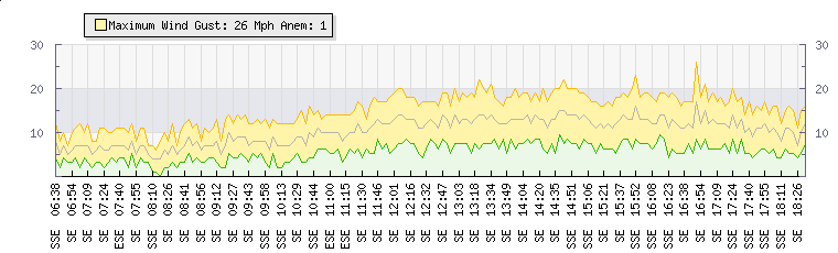 In the last few minutes the wind was South South East at an average speed of 12 mph, reaching up to 17 mph and a low of 7 mph. The gust strength is10 mph above the minimum speed |
